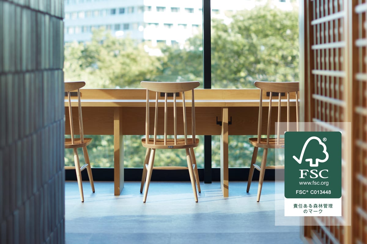 2023年総合家具カタログでは、森林の適切な管理と健全な育成を支援するFSC®認証製品を充実させ、持続可能な社会の実現へ向けた取り組みを進めています。