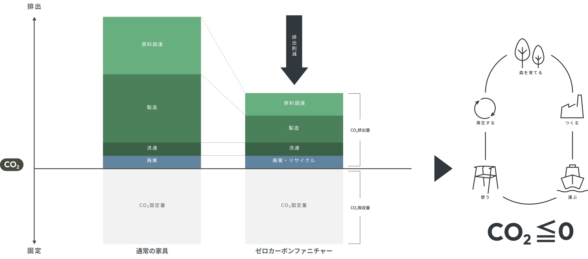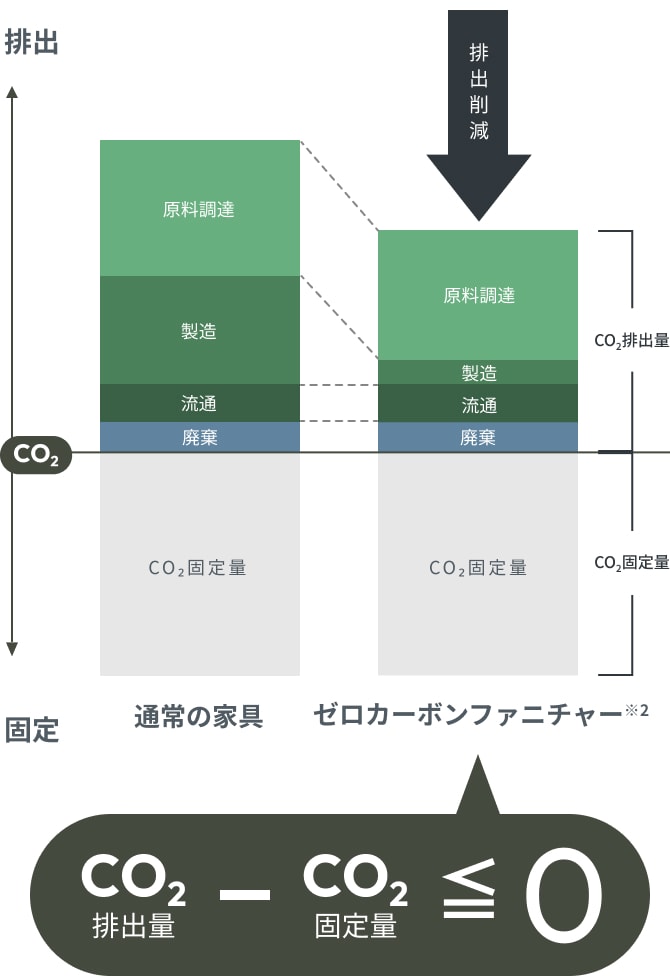 「ゼロカーボンファニチャー」はオリバーが独自に開発した製品で、材料調達や製造段階におけるCO2排出量削減に加え、リサイクルを通じて木材に固定されたCO2を一定期間維持することで、カーボンクレジットに頼らず「CO2排出量実質ゼロ」を実現しています。環境負荷を抑えながら、デザイン性や機能性を兼ね備えた家具として、商業施設に適した空間づくりを実現します。