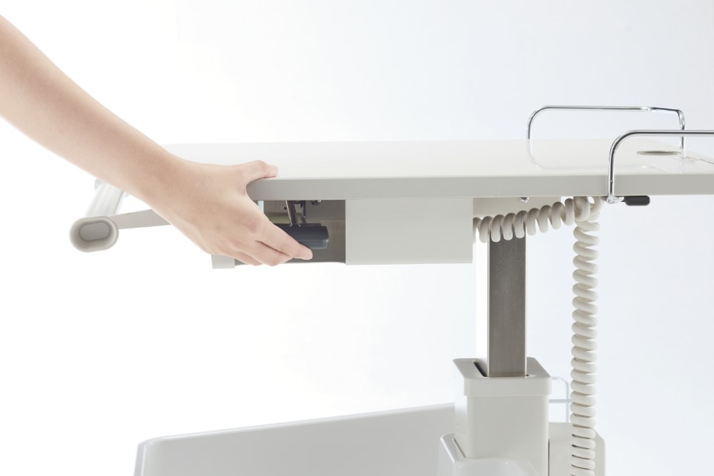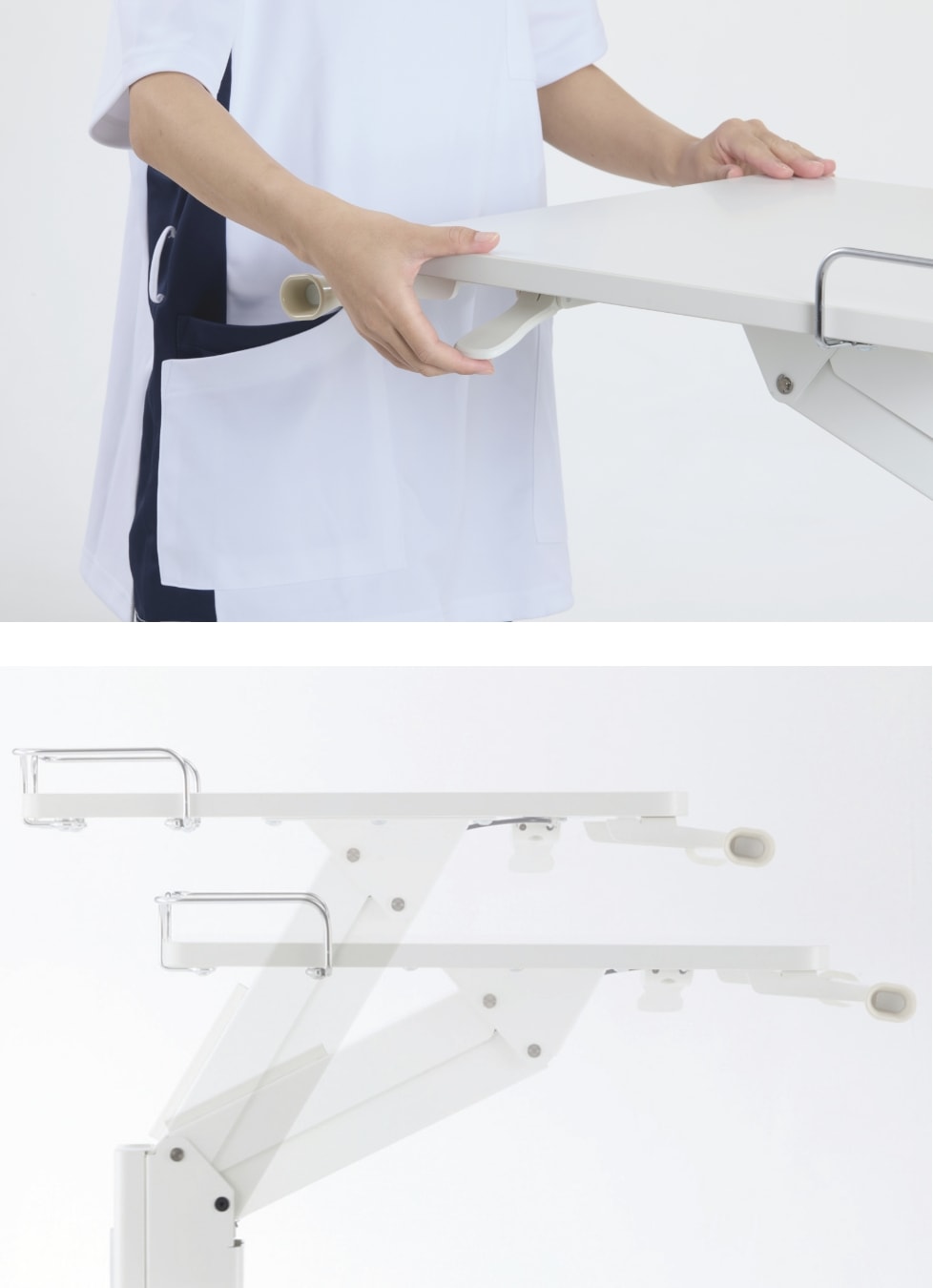 平行リンク機構により、天板はワンアクションで上下昇降しながら前後にスライド。下げると手前に寄り、座位での作業がしやすく、上げれば奥行がコンパクトになり、移動や立位での作業も快適です。任意の位置で固定でき、身長や作業スタイルに合わせて調整が可能です。
