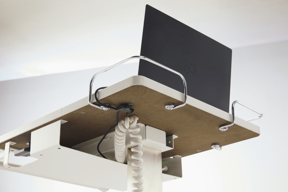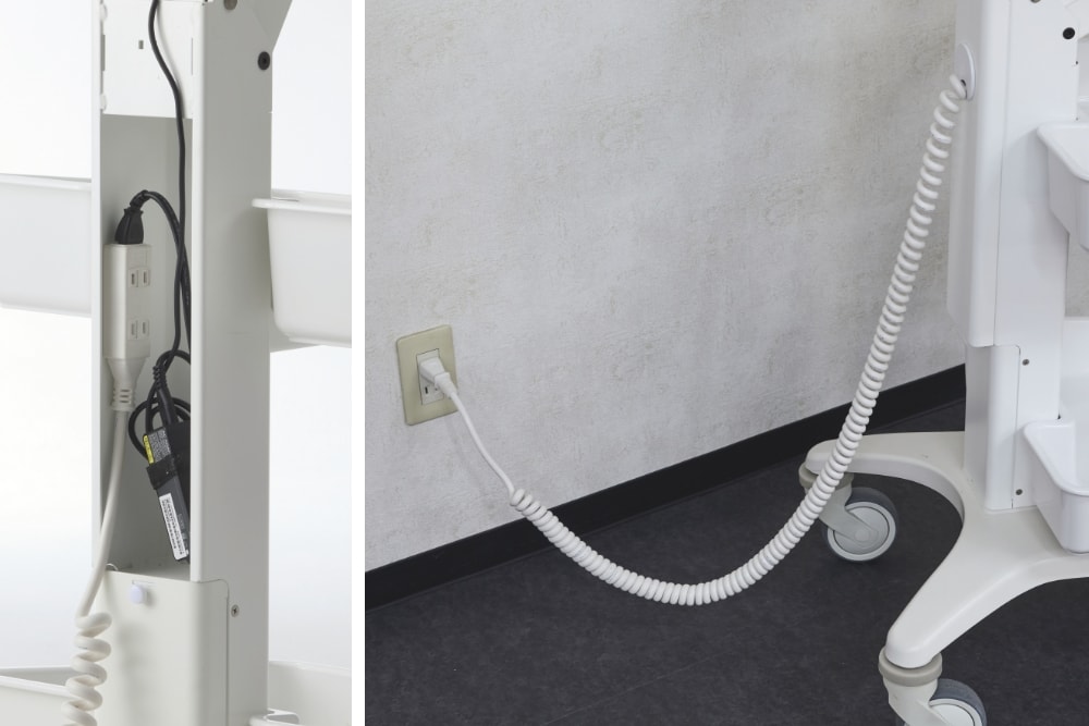 支柱内部にACアダプタを収納できる設計で、床に触れず清潔に保てます。オプションのカールコードを組み合わせることで、断線リスクを抑えつつ、伸縮性のあるコードが病室内のコンセント位置にも柔軟に対応します。