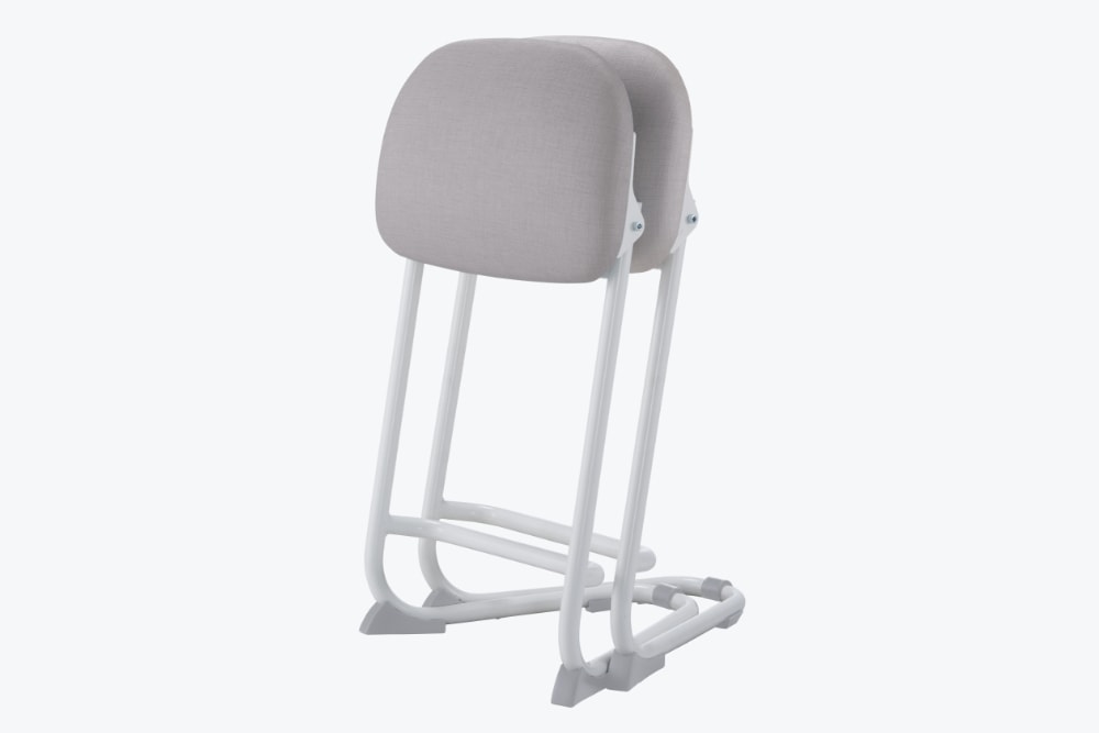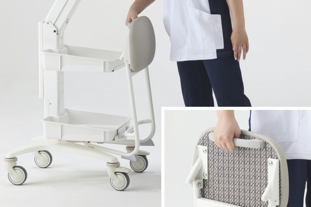 オプションのスツールを装着すれば、どこでも座って作業できます。取手付きで片手で脱着が可能。立ち座りしやすくケアにもスムーズに移行できます。