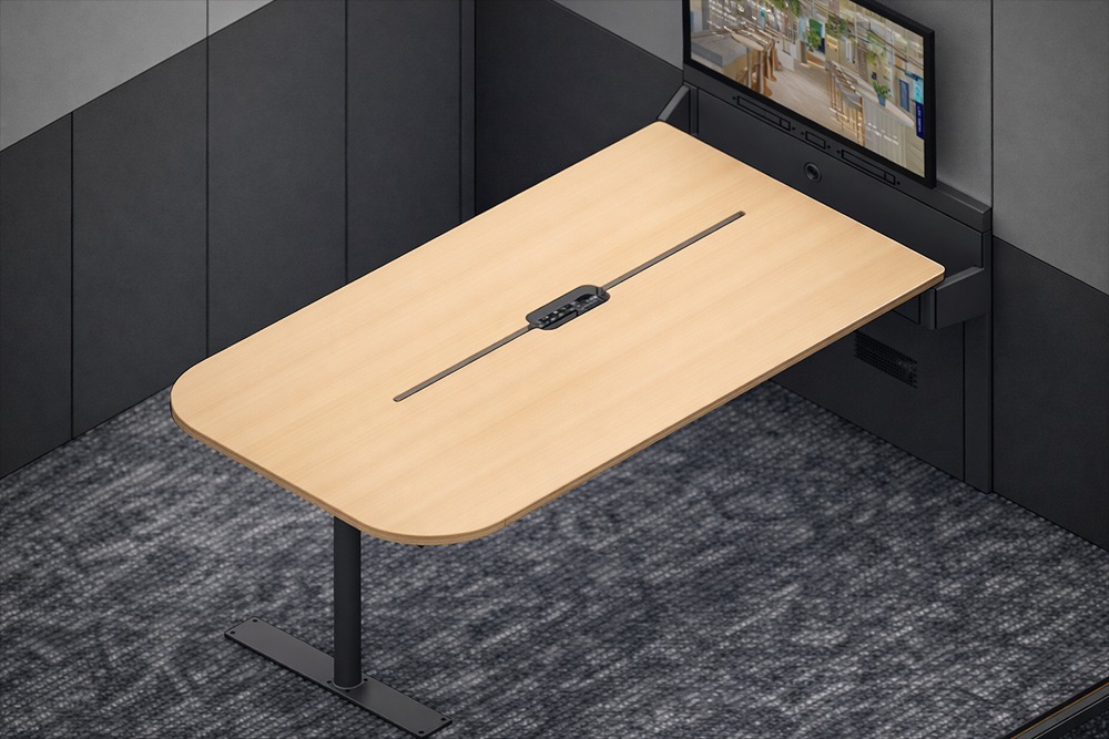 天板がスライドするテーブルをオプションでお選びいただけます。天板に配線孔および配線ボックスが設置されており、快適な外部とのオンラインミーティングが可能になります。