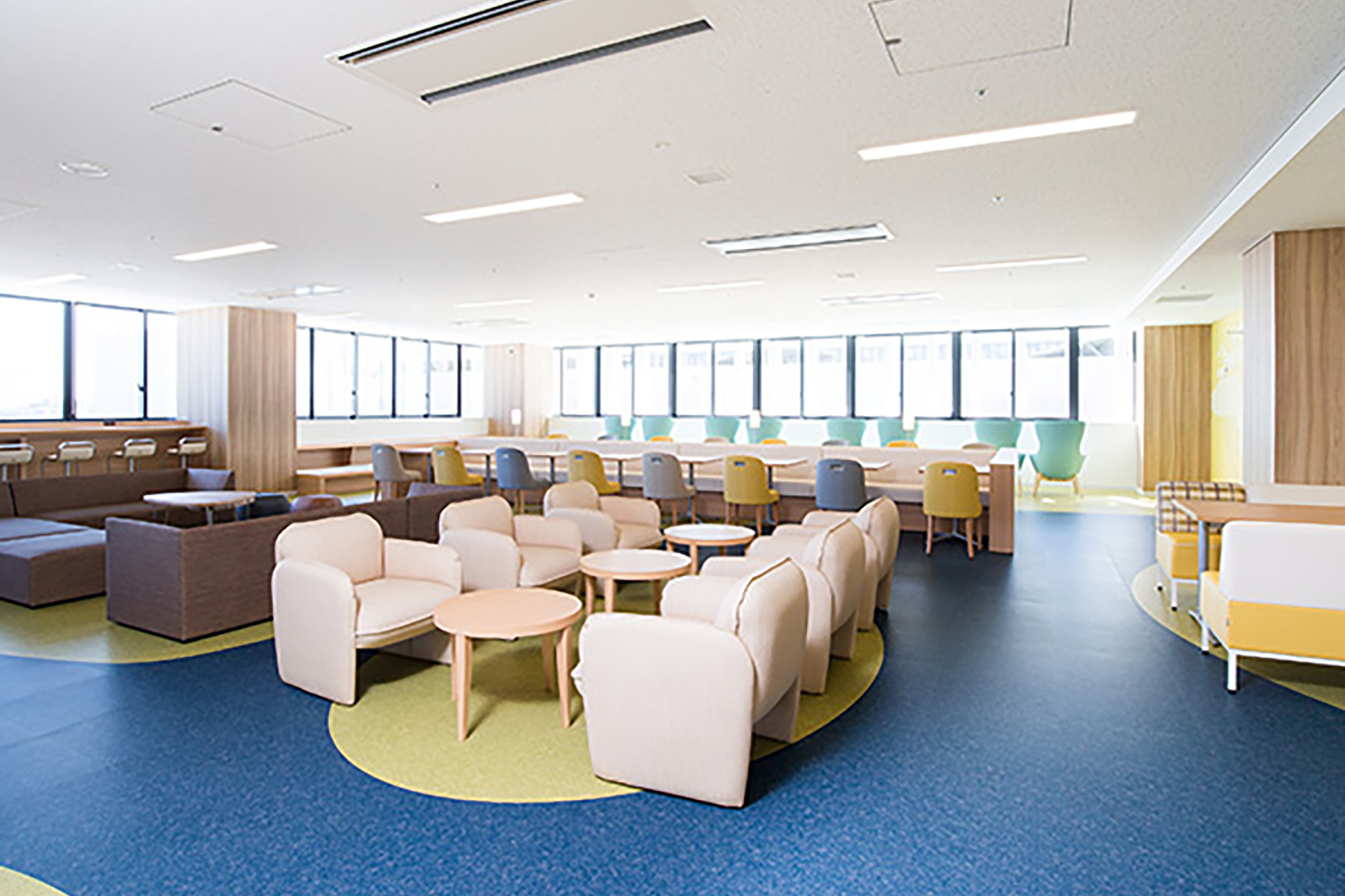 内装や造作家具、既製品家具をトータルでご提案し、個人での利用はもちろん、グループでの利用もできるよう、多種多様な空間に仕上げています。