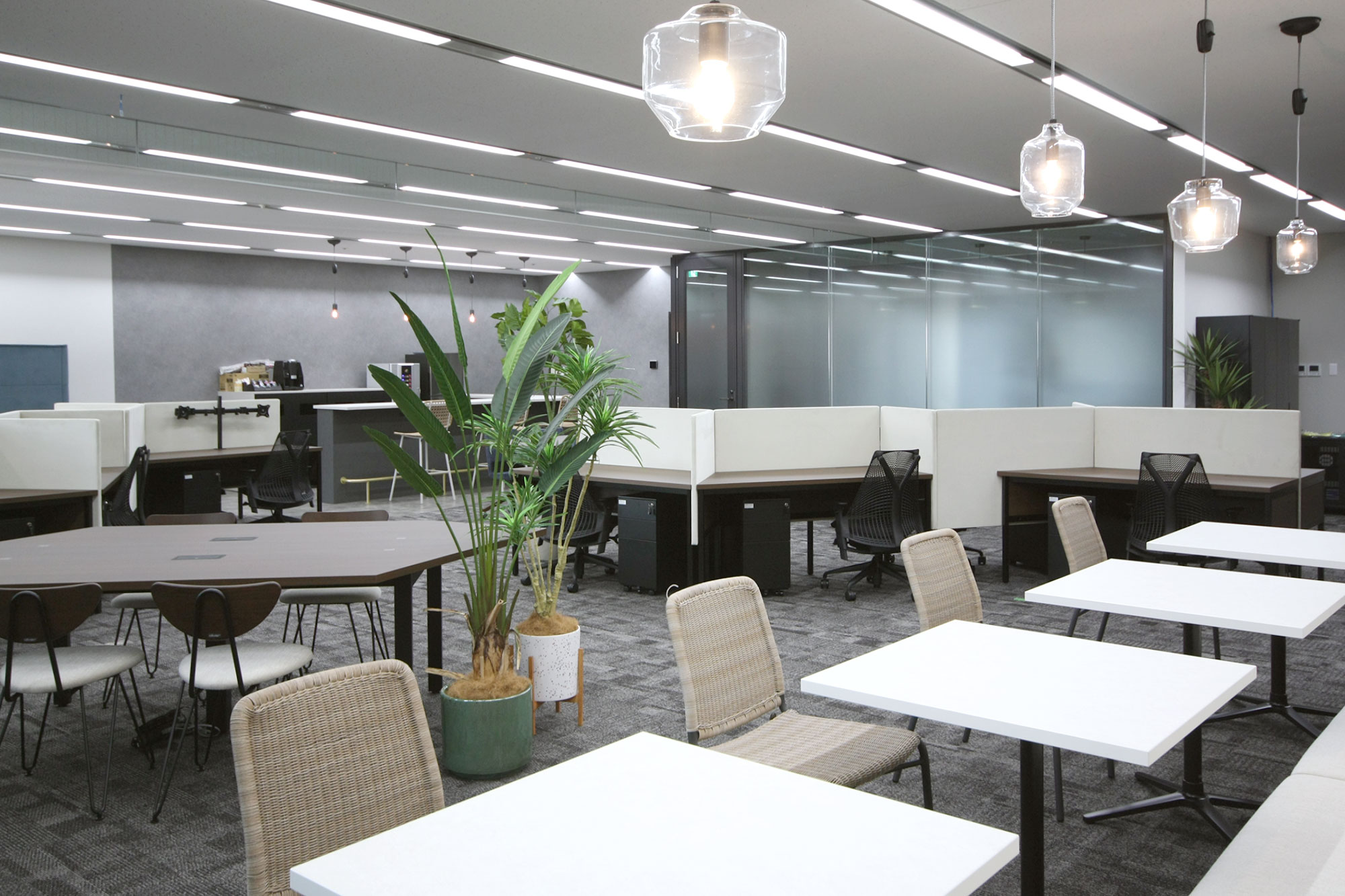 カフェカウンターのスペースは、光のある場所に集いたくなる心理からペンダントライトを取り入れ、また、ワークスペースと床材を張り分けることで空間を切り替え、リフレッシュできるエリアとしました。