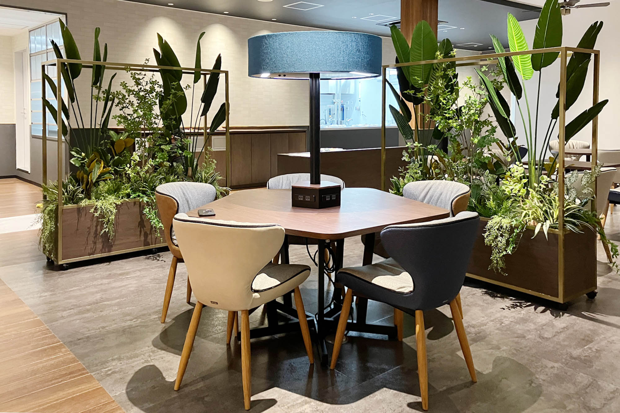 従業員の方がくつろいで過ごせるラウンジ空間として、従来の無機質なオフィス感がない、高級感のある空間をご提案しました。適度にグリーンを盛り込むことで、落ち着いたトーンの空間に華やかさも持たせています。
